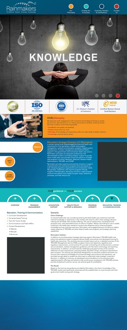 Responsible for front end design, and storyboarding of proposed (and accepted) new web site for Rainmakers Strategic Solutions. Sketch shows 1 of 4 top slider graphics, and 2 sections "revealed" with slide in elements and paralax features.